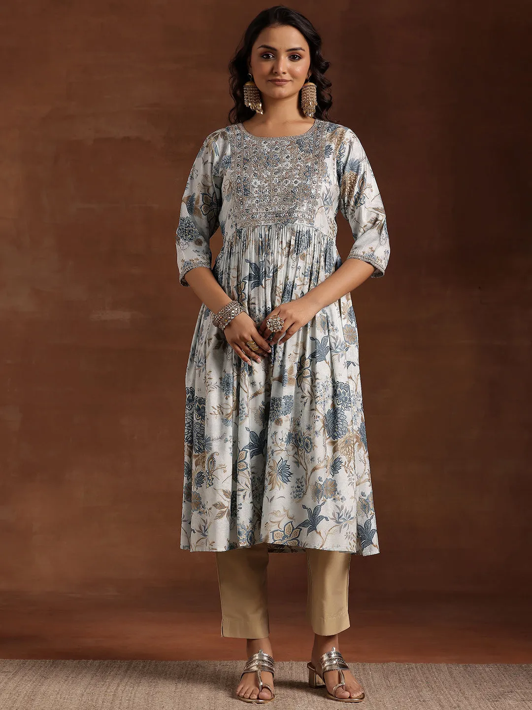 Blue Printed Silk A-Line Kurta
