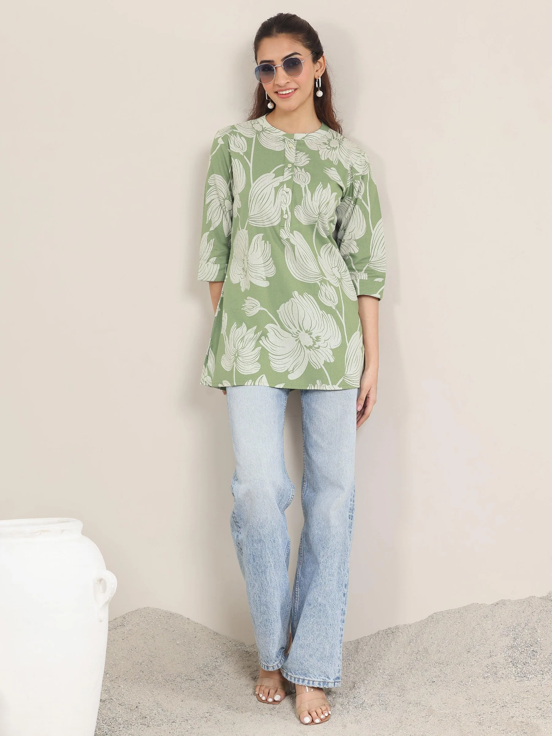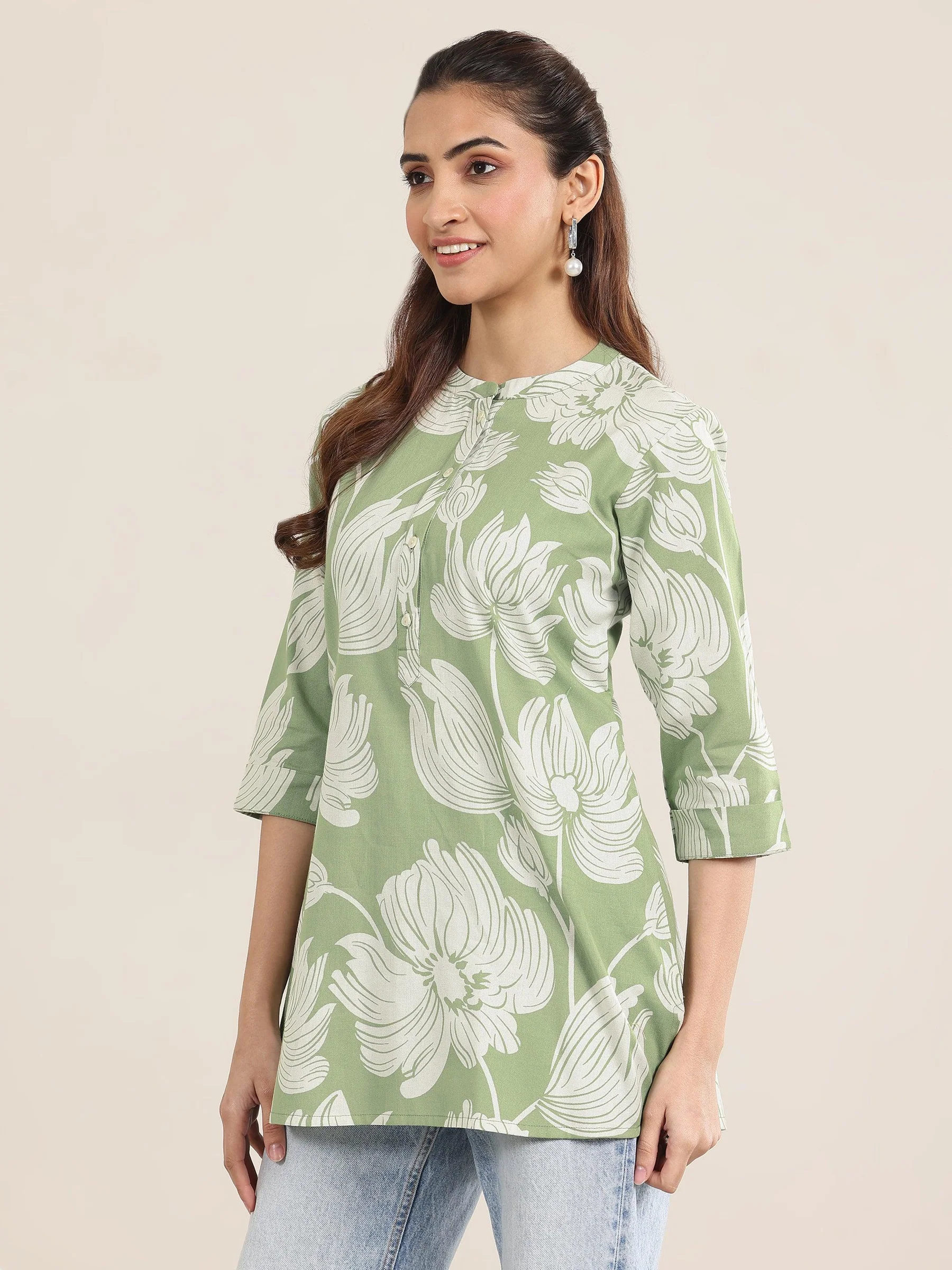 Green Printed Cotton Straight Short Kurti