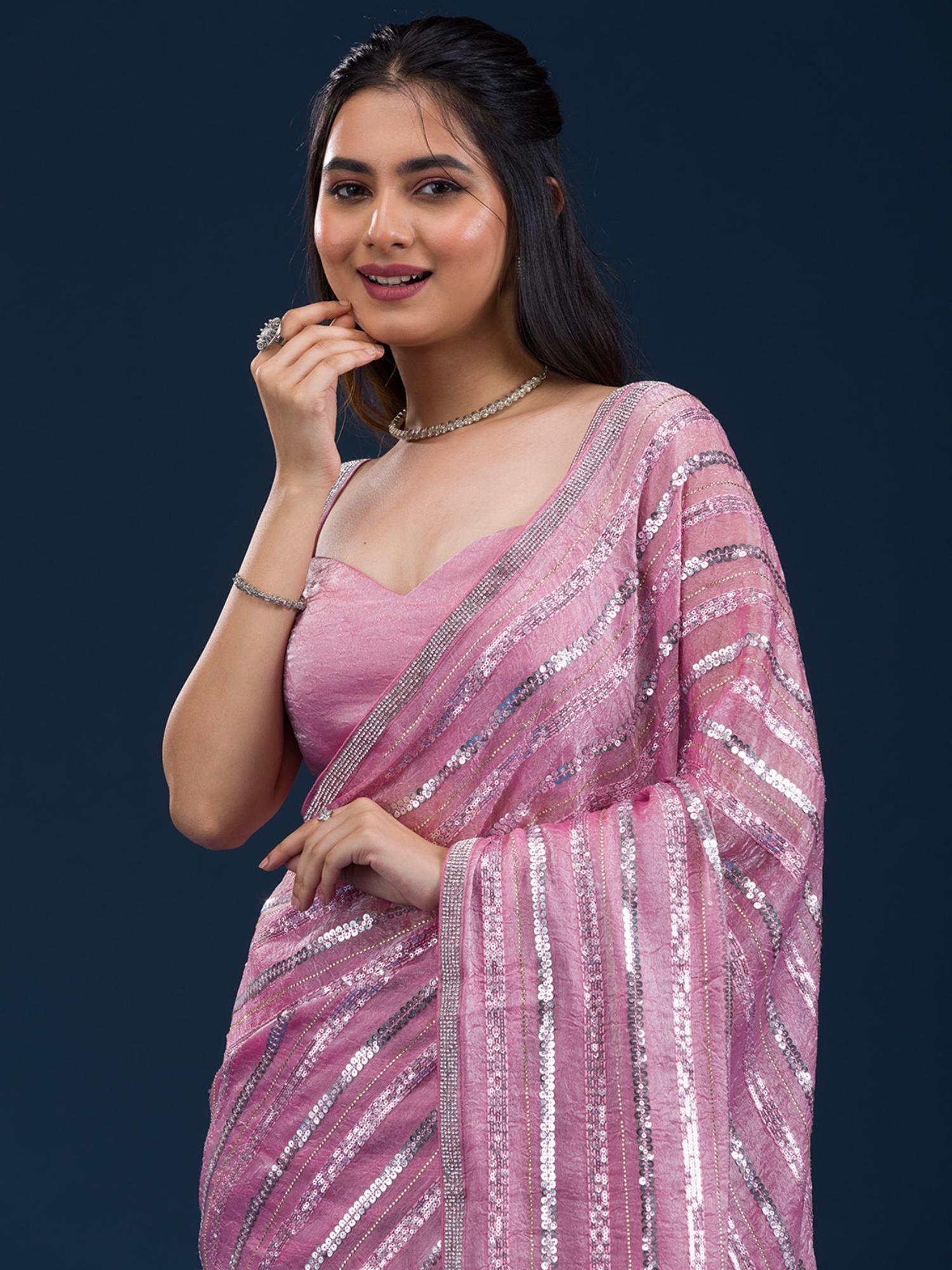 Onion Pink Sequins Semi Crepe Saree with Unstitched Blouse