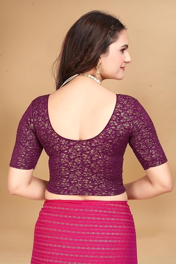 Round Neck Jacquard Elbow Sleeve Readymade Saree Blouse for Women Stylish